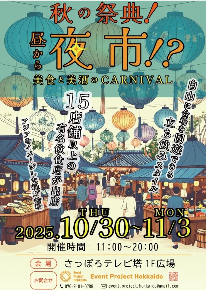 2025年10月30日から11月3日まで、さっぽろテレビ塔1F広場(札幌市中央区大通公園1)にて「第2回 秋の祭典!昼から夜市!? 美食と美酒のCARNIVAL」が開催されています。