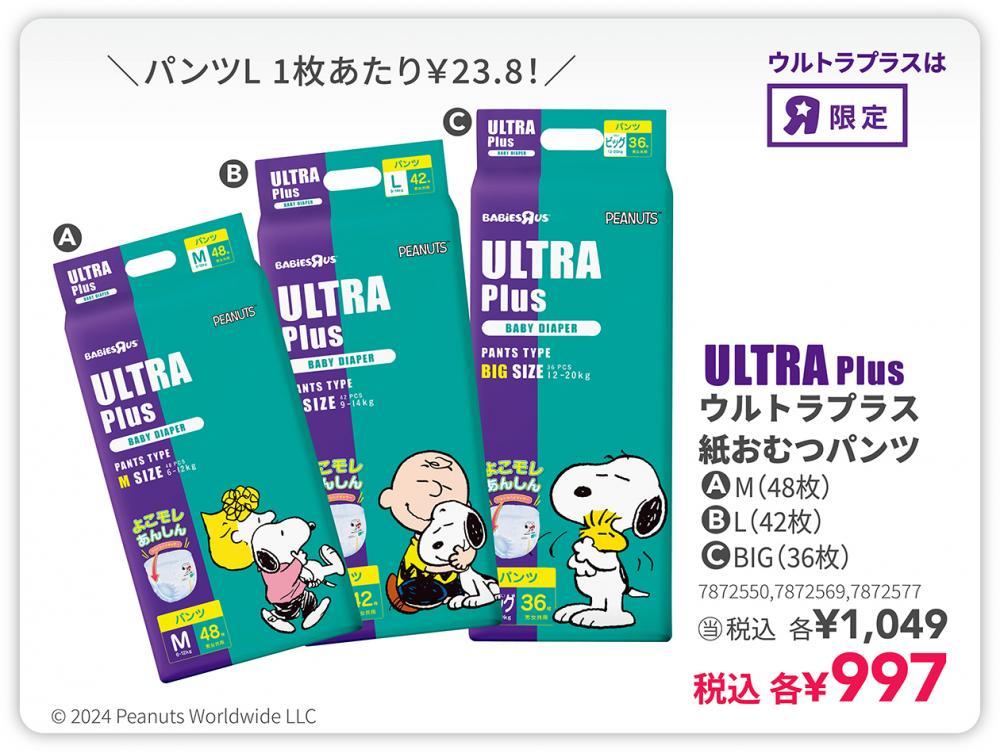 期間中、ベビーザらスのオリジナルブランド「ウルトラプラス」紙おむつやおしりふき、そのほかベビーフードなど、子育てに欠かせない40品目以上を特別価格で販売しています。
