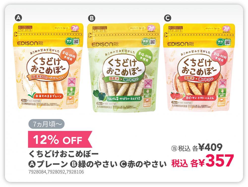 7か月頃から食べられる「くちどけおこめぼー」は、いずれも通常価格409円のところ357円に。プレーン、緑のやさい赤のやさいの3種です。