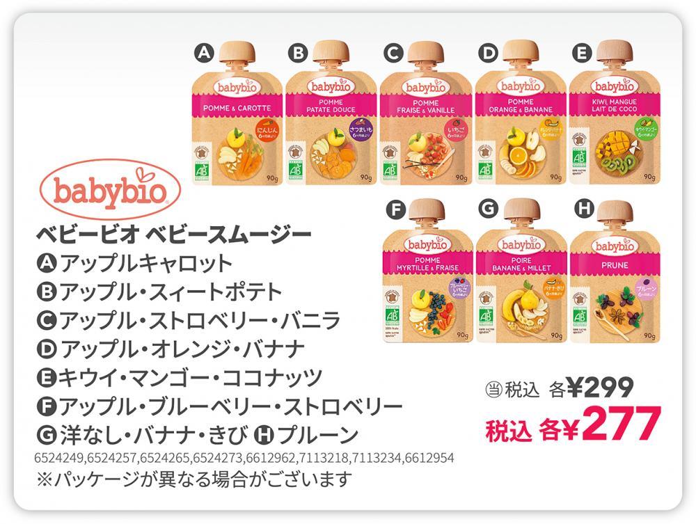 アップルキャロット、アップル・スィートポテト、アップル・ストロベリー・バニラ、アップル・オレンジ・バナナ、キウイ・マンゴー・ココナッツ、アップル・ブルーベリー・ストロベリー、洋なし・バナナ・きび、プルーンの味があります。