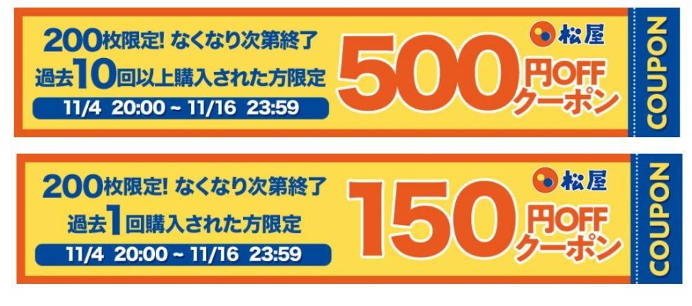 2年以内に10回以上買い物をしたことがあるヘビーユーザーは「500円オフクーポン」が使えます。なお、1回でも買い物をしたことがあれば「150円オフクーポン」が使えますよ。