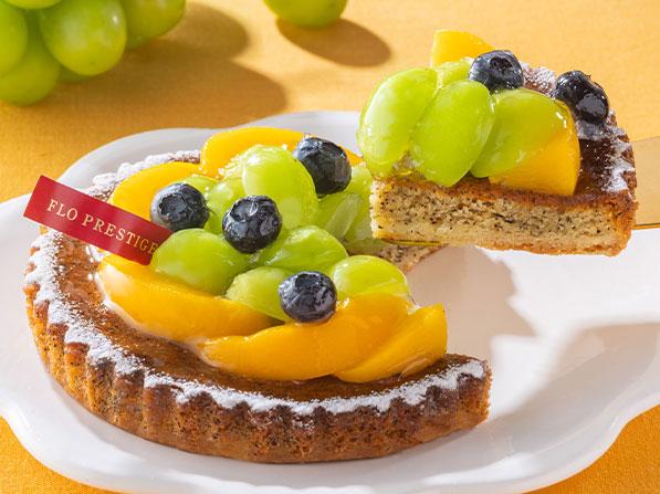 11月の「FLOの日」限定タルトは、みずみずしく色鮮やかなシャインマスカットにとろりと優しい甘さの黄桃シロップ漬けを合わせた「シャインマスカットと黄桃のタルト」。日によって土台の味わいが異なる「シャインマスカットと黄桃のタルト」を販売します。