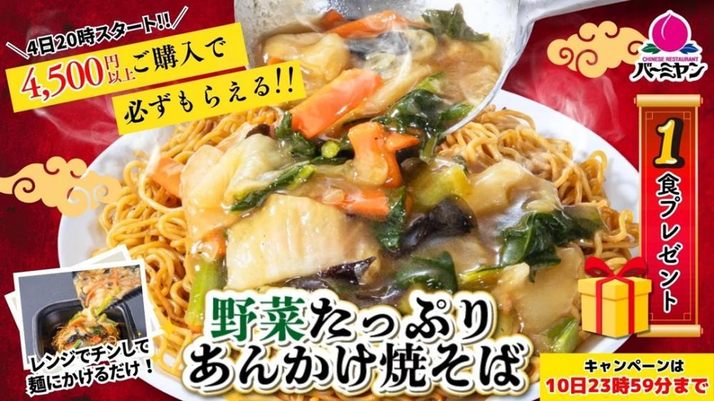 また、4500円以上の買い物で「野菜たっぷりあんかけ焼そば」1食がもらえます。対象期間は、4日20時から10日23時59分までです。