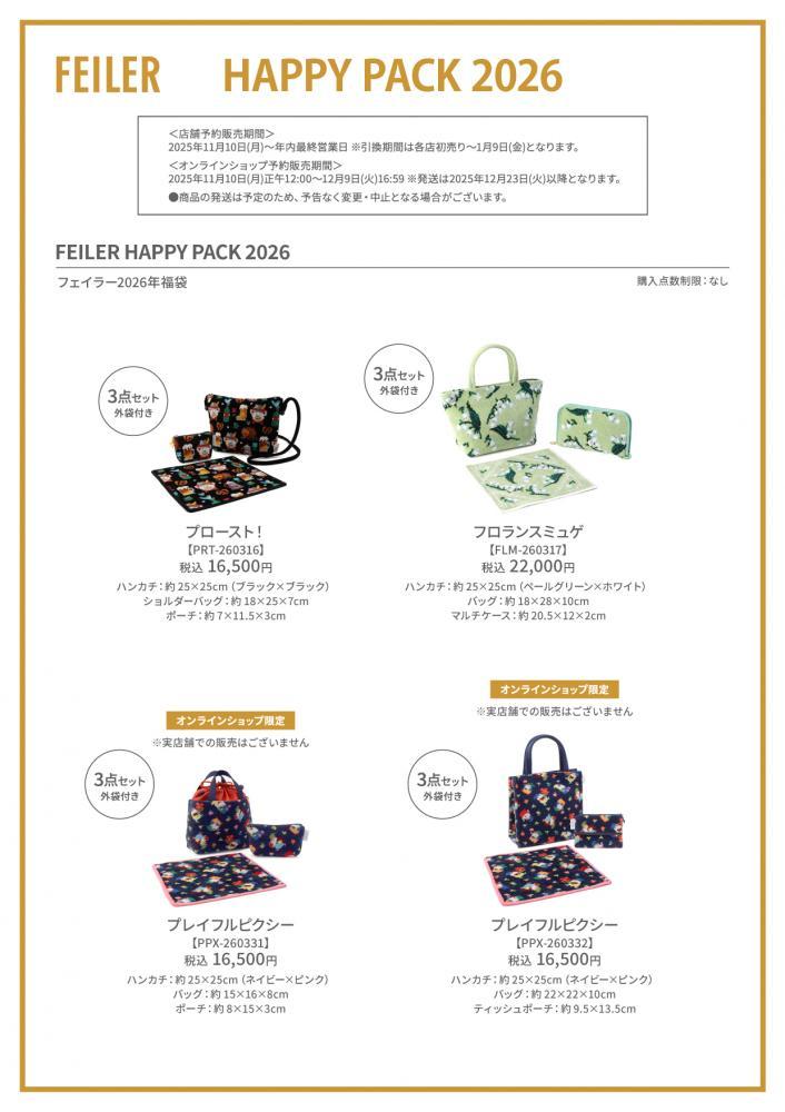 11月10日から「FEILER HAPPY PACK 2026(フェイラー2026年福袋)」の予約が始まります。実店舗では2種類、公式オンラインショップではさらに2種類の限定セットを用意。いずれも数量限定・なくなり次第終了です。