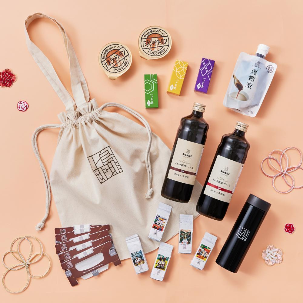 「上島珈琲店 ミルク珈琲ベース(希釈)」2種、「上島珈琲店の黒糖蜜<お店の黒糖ミルク珈琲に使用>」、「ひとくち羊羹」3種、「アデリー 秋川牧園 たまご村プリン」2つ、「上島珈琲店」のレギュラーコーヒー(粉)5種のセット。加えて、いずれもオリジナルロゴ入りの「真空ステンレスボトル(230ml)」「巾着トート」が入っています。