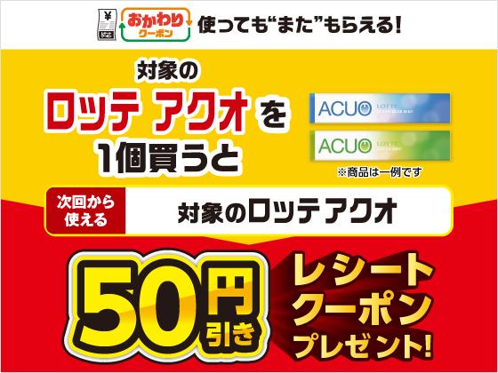 11月11日から24日までの期間、対象のロッテ「ACUO(アクオ)」を1個購入するごとに、次回使える50円引きクーポンがもらえます。