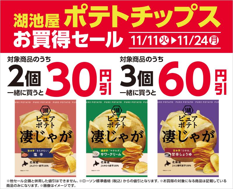 11月11日から24日までの期間、湖池屋のポテトチップスを2個一緒に購入すると30円引き、3個一緒に購入すると60円引きになります。