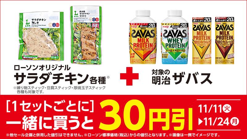 11月11日から24日までの期間、ローソンオリジナルのサラダチキン各種と対象の明治「ザバス」を一緒に購入すると、1セットごとに30円引きになります。
