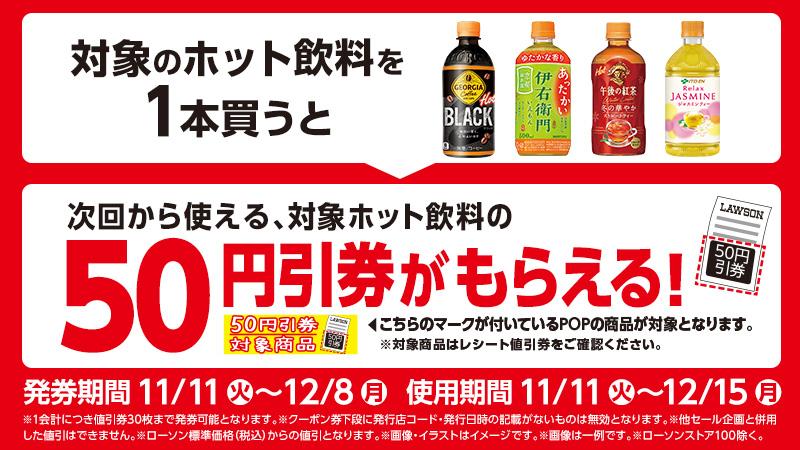 11月11日から12月8日までの期間、対象のホット飲料を1本購入すると、次回使える50円引きクーポンがもらえます。