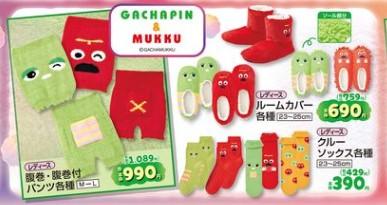 ガチャピンとムックの魅力がギュッと詰まったルームウェアは、ファン必見!「腹巻・腹巻付パンツ各種」(1089円)、「ルームカバー各種」(759円)、「クルーソックス各種」(429円)と、どれもキュートなデザインで迷ってしまいます......。