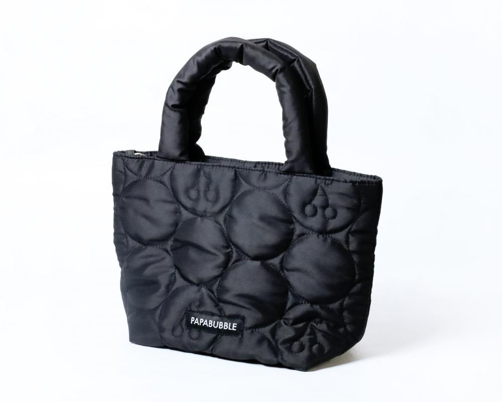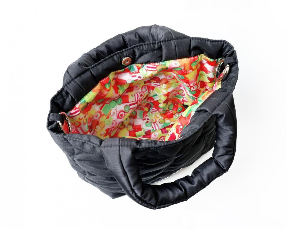 温もりのあるキルティング素材のオリジナルバッグに、人気キャンディ柄「チェリー」をあしらい、裏地にはフルーツミックス柄を採用。カラビナ付きで、手持ちの紐を付ければ肩掛けにもできる仕様です。