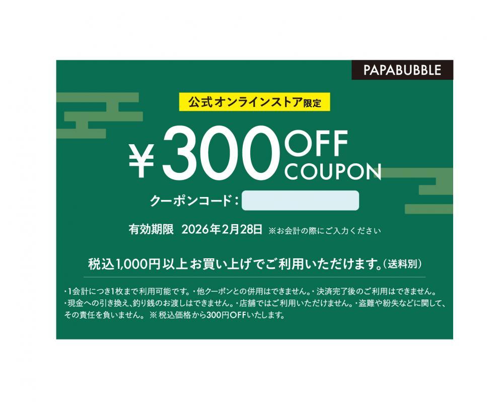 さらに、公式オンラインストアで購入した人には、1000円以上の買い物で使える300円オフクーポンがもらえます(1会計につき1枚)。