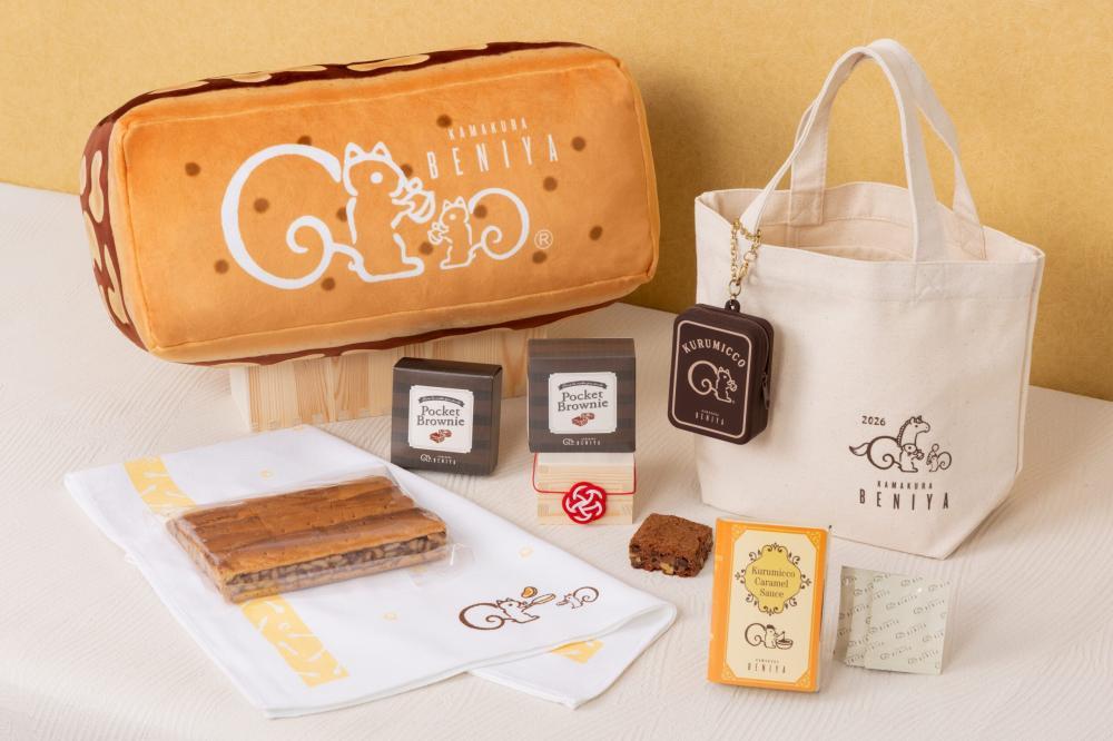 看板商品・クルミッ子を再現したクッションや2026年の干支にちなんだ"うまリスくん"を描いたトートバッグ、クルミッ子の切り落としなど、全6種類が入っています。
