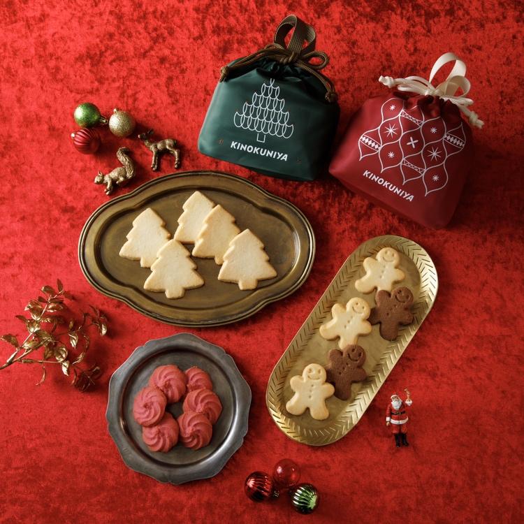 クリスマス柄の巾着バッグ2種類に、『クリスマス島の塩クッキー(ツリー)』『ミニジンジャーマンクッキー』『いちごのスペシャルクッキー』の3種類の焼菓子を詰め合わせた限定のスイーツセットです。