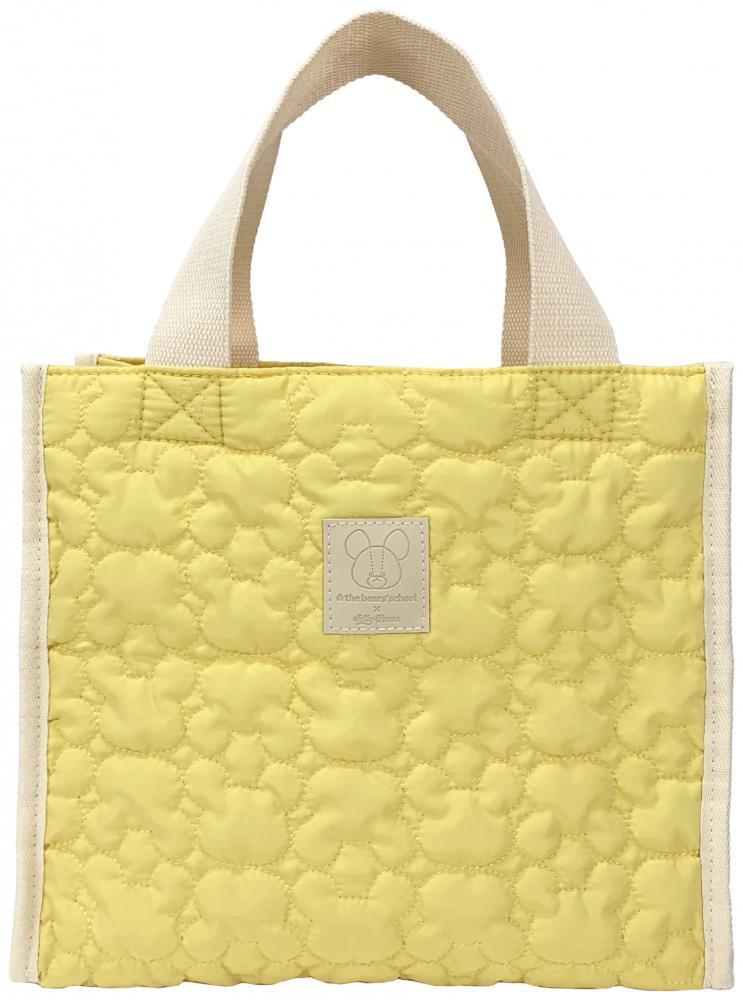 ふわふわのキルティング生地を使ったトートバッグ。表面は「くまのがっこう」の「ジャッキー」イメージのキルティングパターンを施したパステルイエローの生地に、コラボレーション限定タグをあしらっています。マチを備えていて収納力があり、普段使いにも活躍してくれそうです。