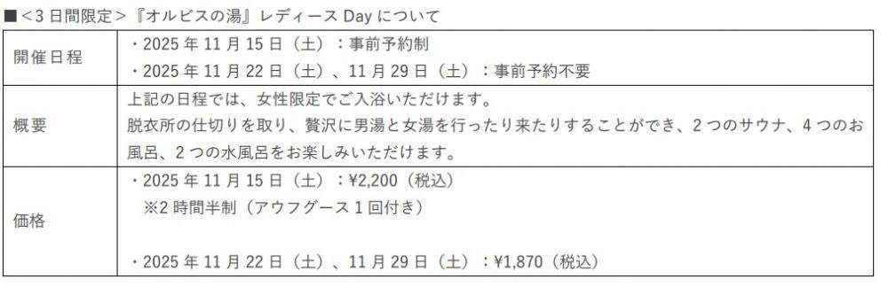 土曜日はレディースDayのため女性のみ入場可。事前予約は不要です(11月15日のレディースDayを除く)。