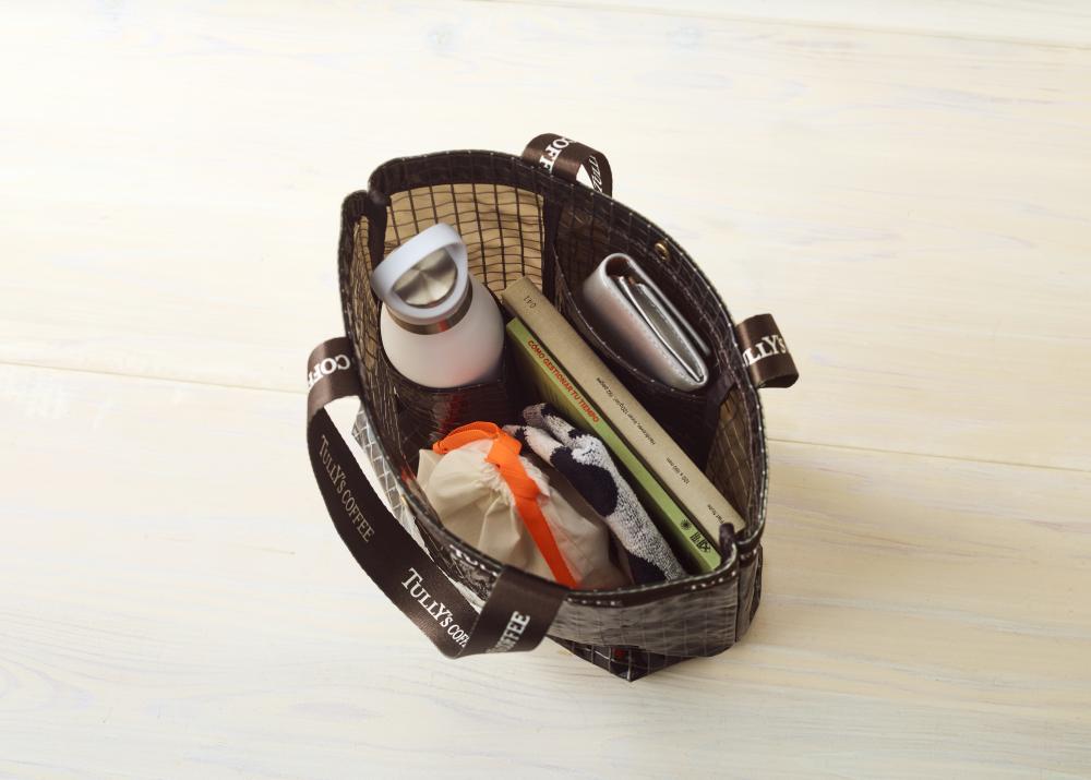 限定トートバッグはブラウンカラー。PVC素材を使い、中身がうっすらと見える程よい透け感です。内側にはポケットやタンブラーホルダーを備えるなど機能性にもこだわっています。
