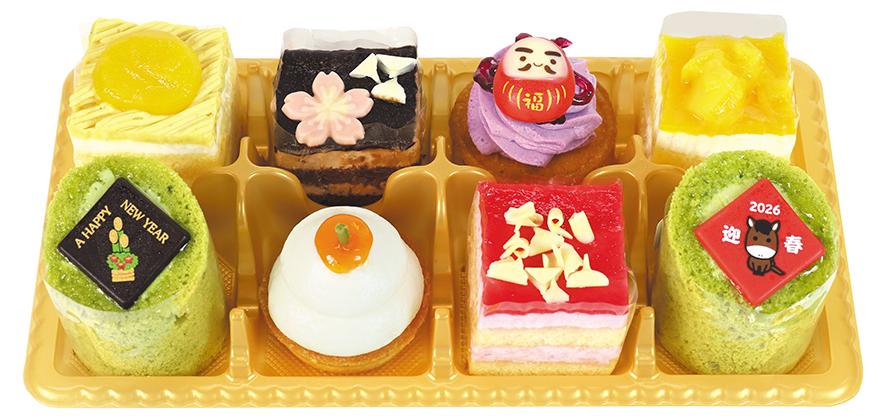 門松をイメージしたロールケーキに、迎春の飾りつけや鏡餅をイメージしたミルキータルトなど、お正月らしいプチケーキが8種。