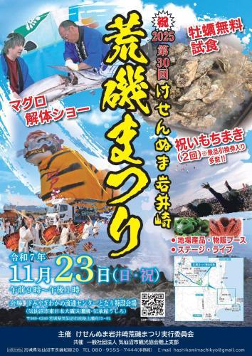 2025年11月23日、JFみやぎわかめ流通センターとなり特設会場(気仙沼市波路上瀬向75-91)にて「第30回けせんぬま岩井崎荒磯まつり」が開催されます。