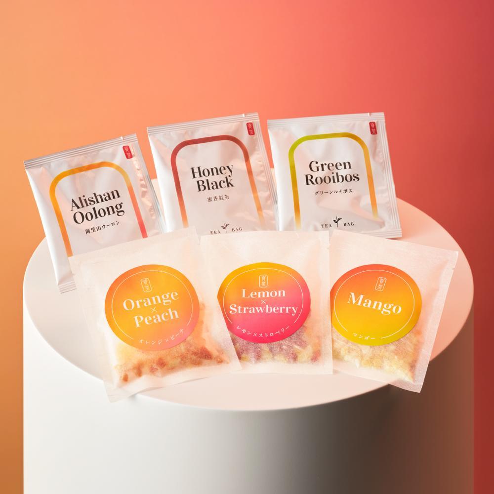 お茶は、華やかでフルーティーな「阿里山ウーロンティー」、さわやかな香りとやさしい甘みの「グリーンルイボスティー」、甘い香りとまろやかなコクの「蜜香紅茶」の3種(各4g)。ドライフルーツは、「マンゴー」「オレンジ×ピーチ」「レモン×ストロベリー」が入っています。