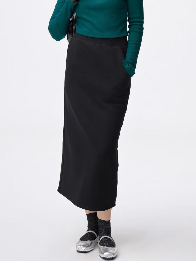 裏起毛の暖かさと、ウエストゴムとスリット入りで動きやすさも支持されるロングスカート。縦のラインが際立ち、スマートで上品なシルエットも手に入りますよ。
