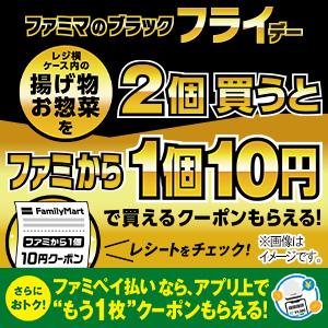 11月18日から12月1日までの期間、レジ横ケース内の揚げ物・お惣菜を2個購入すると、「ファミから」を1個10円で購入できるクーポンがもらえます。