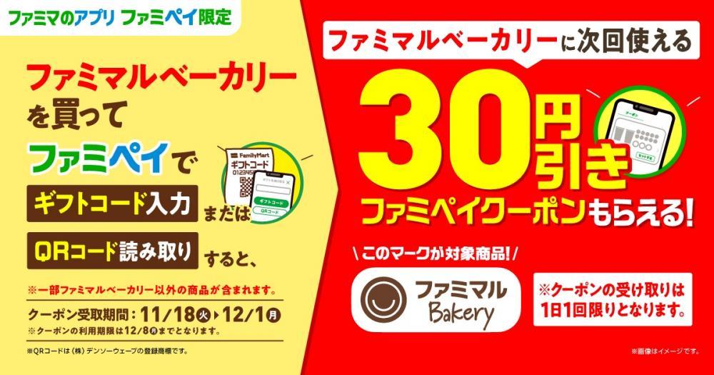 11月18日から12月1日までの期間、ファミマルベーカリーを購入し、ファミペイでギフトコード入力またはQRコード読み取りをすると、次回ファミマルベーカリー購入時に使える30円引きファミペイクーポンがもらえます。