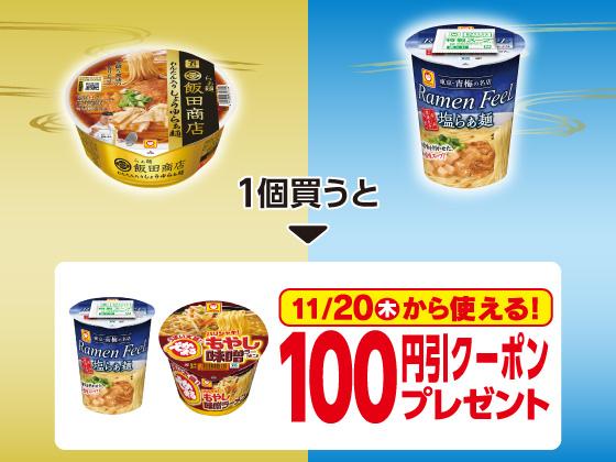 11月13日から19日までの期間、「飯田商店わんたん入りしょうゆらぁ麺」「Ramen FeeL塩らぁ麺」のどちらか1個を購入すると、次回「Ramen FeeL塩らぁ麺」「でかまる もやし味噌ラーメン」のどちらか1個に使える100円引きクーポンがもらえます。