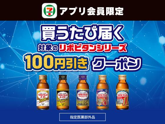 11月13日から26日までの期間、セブン-イレブンアプリを提示して対象のリポビタンシリーズを購入するごとに、次回使える100円引きクーポンがもらえます。