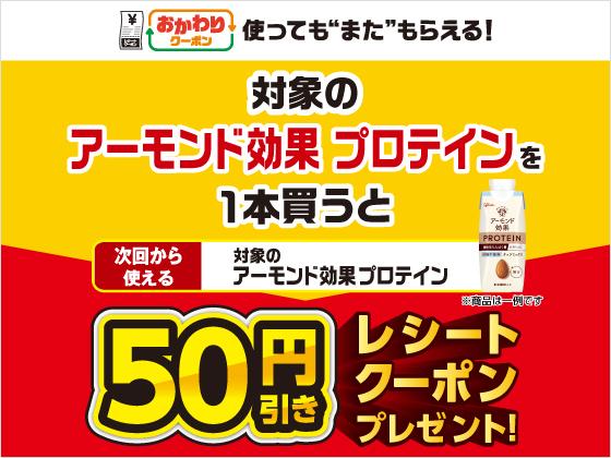 11月13日から12月3日までの期間、対象の「アーモンド効果プロテイン」を購入するごとに、次回使える50円引きクーポンがもらえます。
