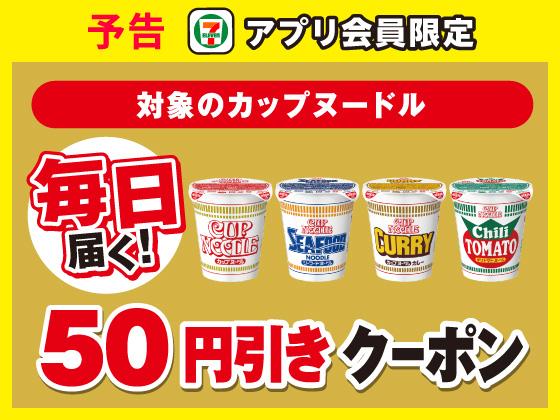 11月20日から26日までの期間、セブン-イレブンアプリの会員限定で、対象のカップヌードル50円引きクーポンが毎日1枚もらえます。