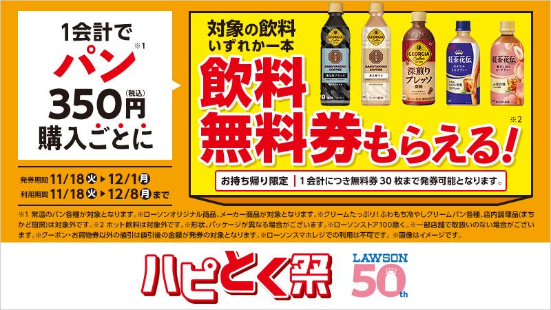 11月18日から12月1日までの期間、1会計でパンを350円購入するごとに、対象の飲料無料券がもらえます。