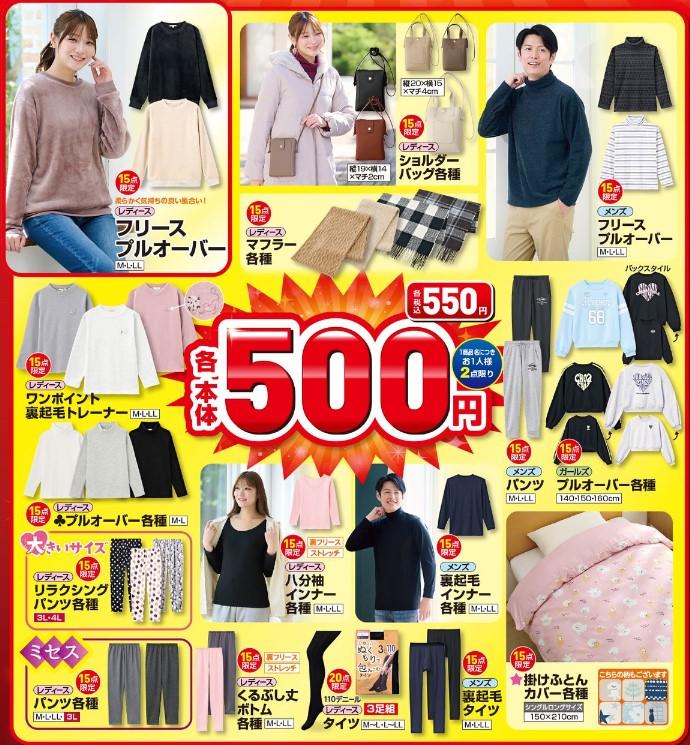 柔らかな肌触りに動きやすさもバツグンな「フリースプルオーバー」や「くるぶし丈ボトムス各種」、季節感のある柄が豊富に揃った「掛けふとんカバー各種」などのアイテムも550円で販売。