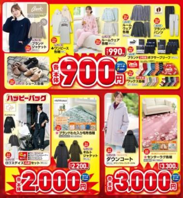 さらに、「裏起毛フード付ワンピース」「ニットカーディガン」「帽子」が770円、「ブランドジャケット」「シューズ各種」「ルームウェア各種」が990円、「ブランドわた入り毛布各種」が2200円、「ダウンコート」が3300円で買えるなど、暖かさと日常使いしやすいデザイン性を併せ持つ、最強コスパな冬用アイテムが揃っていますよ。