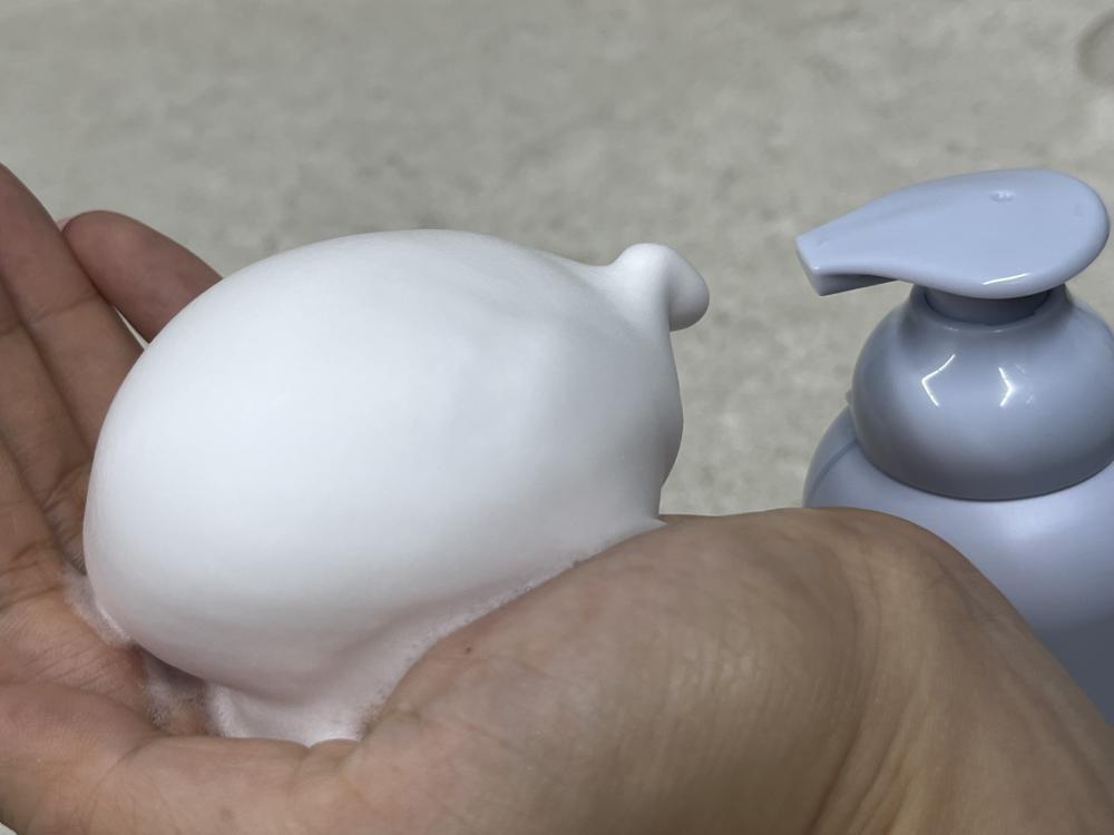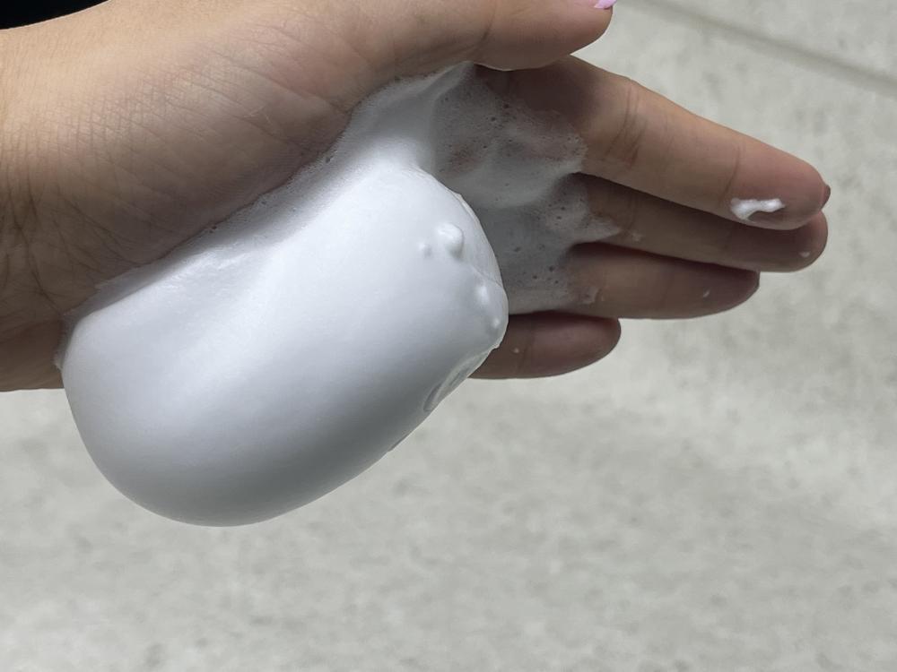 "炭酸(※1)泡"と聞いて、記者は空気を含んだしゅわしゅわの泡を想像していましたが、実際は濃密で弾力感のある、もこもこな泡が出てきました。 ※1 炭酸ガス(噴射剤)