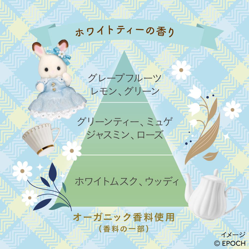香りは、ティーパーティーの楽しげな雰囲気に合わせ、エッセンシャルの香り限定品の中でも人気の"ホワイトティーの香り"。透明感のあるシトラスグリーンに上品なティーのアクセントをまとわせ、さらにホワイトムスクとウッディのあたたかさを追加した香りです。