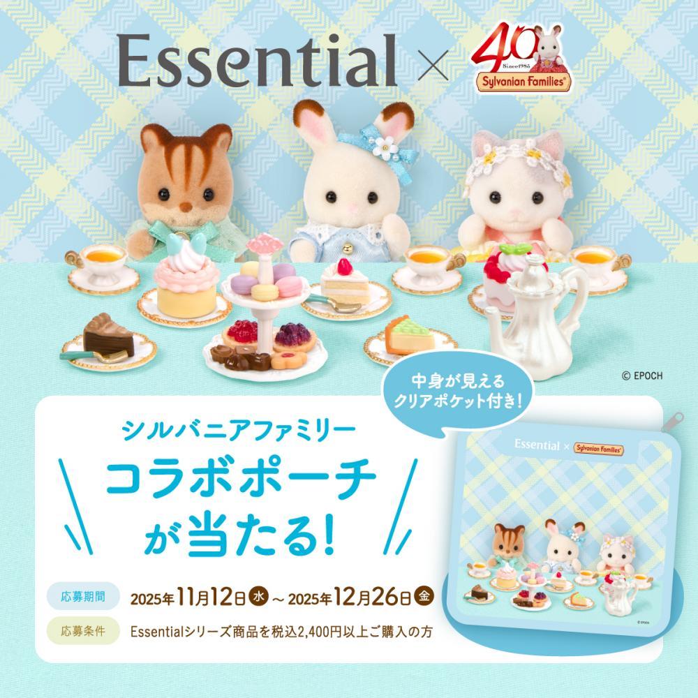 なお、「Essential」シリーズを買うと、「Essential×シルバニアファミリー コラボデザインポーチ」が抽選で100人に当たるキャンペーンを11月12日から実施しています。対象商品を2400円以上購入したレシートを1口として応募できます。