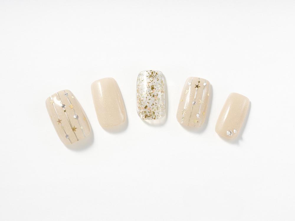 キラキラ舞う風を思わせる小粋な白味グレージュカラー。ゴールドラメとシルバーラメがポイントです。