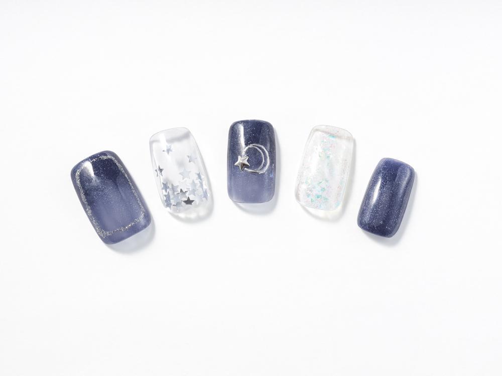 シルバーのラメが水面に映る星のようにきらめく、穏やかで深みのあるブルーです。
