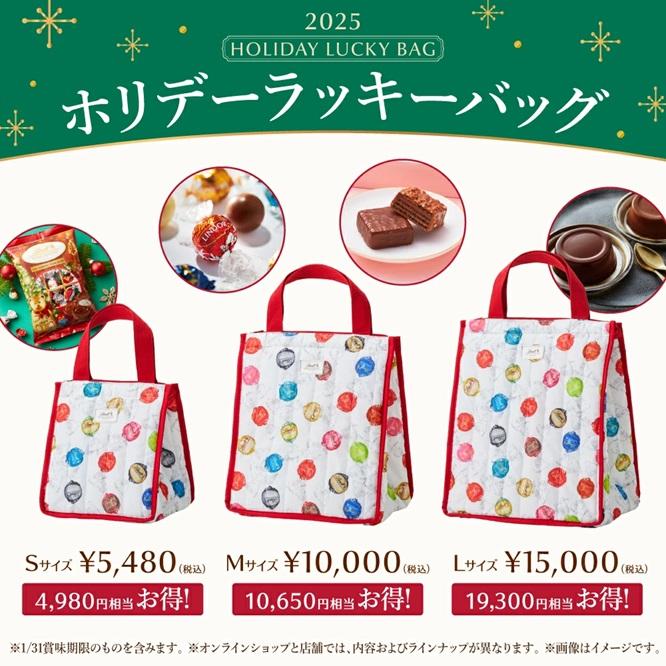 スイス発祥のチョコレートメーカー「Lindt(リンツ)」の福袋が今年も登場。「ホリデーラッキーバッグ2025」は、Sサイズ(5480円)、Mサイズ(1万円)、Lサイズ(1万5000円)の3種類があります。