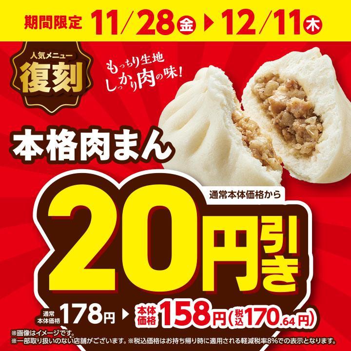 11月28日から12月11日までの期間、「本格肉まん」が本体価格から20円引きで購入できます。
