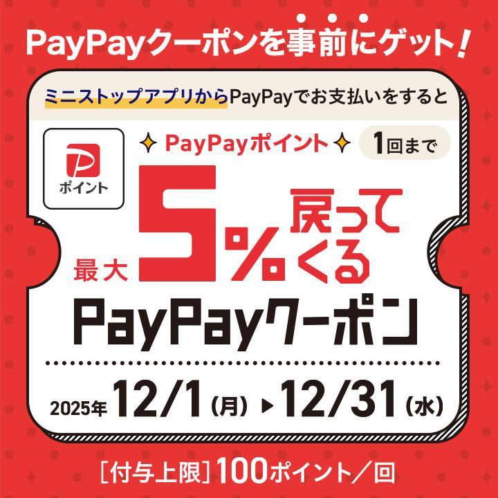 12月1日から31日までの期間、事前にクーポンを獲得してミニストップアプリからPayPayで支払いをすると、最大5%が戻ってくるキャンペーンを開催しています。