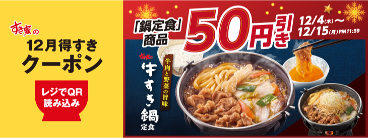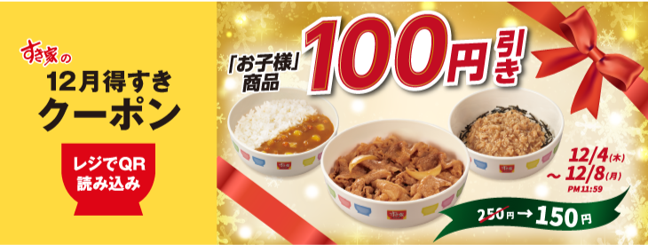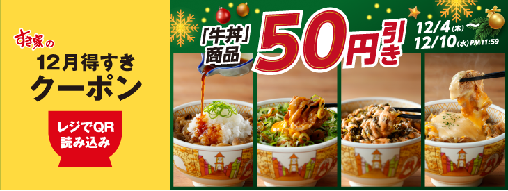 牛丼チェーンの「すき家」は、2025年12月4日から「12月得すきクーポン」第2弾を配信しています。
