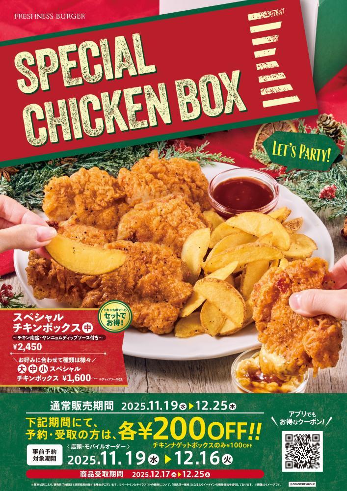 フレッシュネスバーガーは、2025年11月19日から期間限定で、ホームパーティーやクリスマスにぴったりな『スペシャルチキンボックス』を販売しています。