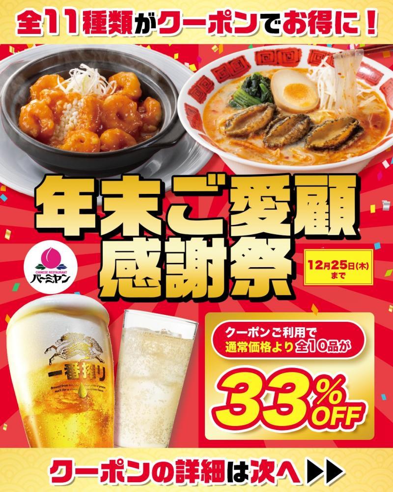 バーミヤンの公式Xが12月11日に投稿した「年末ご愛顧感謝祭33%OFF特別クーポン」。お得になる対象メニューは全10品です。