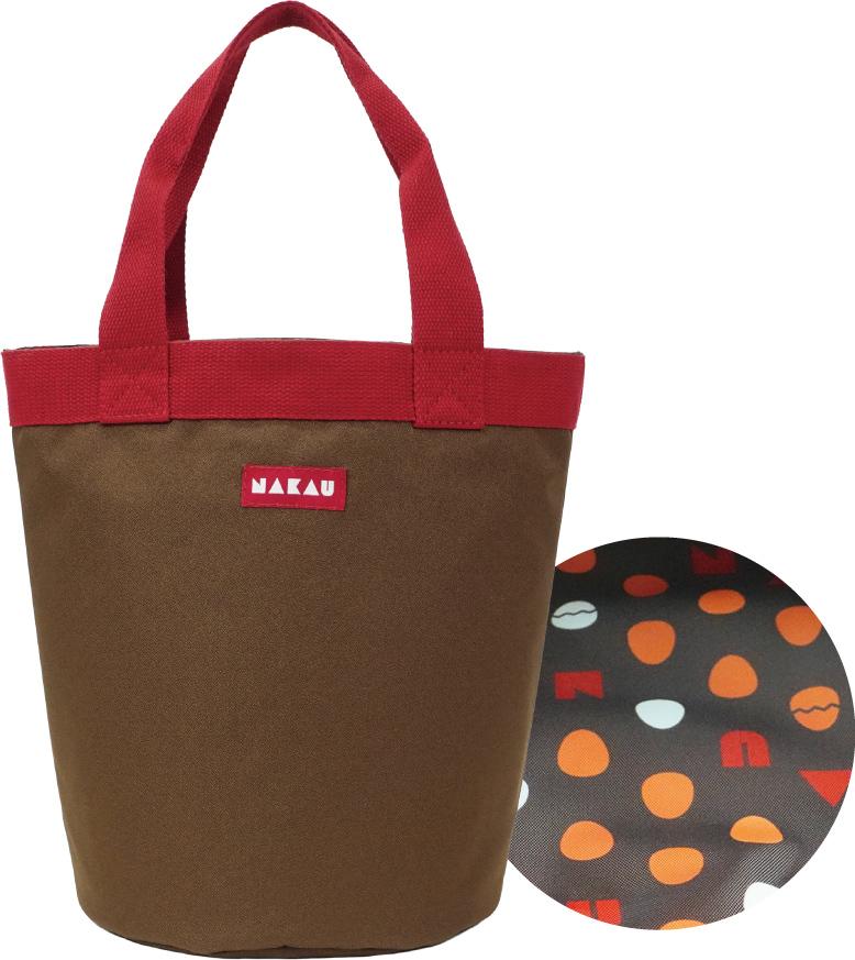 なか卯の赤いワッペンを配した、落ち着いた風合い。裏地には、"こだわり卵"がモチーフのたまごデザインをあしらっています。大容量のバケツ型で、荷物の多い日のお出かけにも活躍してくれそうです。