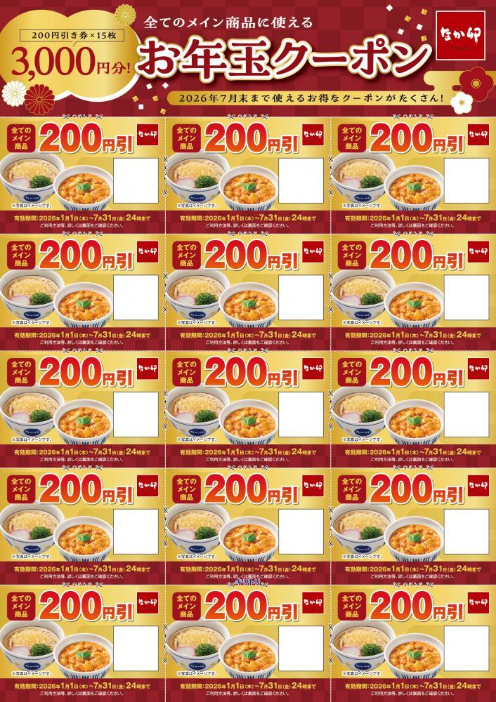 一部店舗を除く全国のなか卯で使えます。メイン商品1品につき1枚利用可能で、釣銭は出ません。有効期間は26年1月1日から7月31日までとなっています。