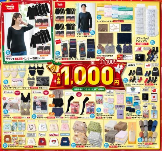 "着るホカロン"シリーズの「ブランド4枚組インナー各種」にしまむら限定の「デイリー満足タイツ5点セット各種」、ディズニーやサンリオキャラクターズなどを描いた「キャラクターソックス6足セット各種」、大容量で毎日気兼ねなく使える「フェイスシートマスク100枚セット」や「ソフトパックティッシュ30個セット」など。