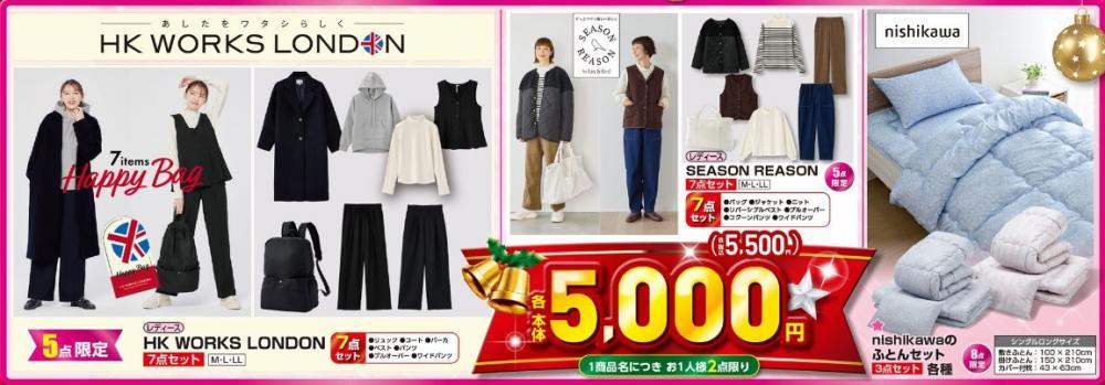 リュックやコート、ワイドパンツなどが入った「HK WORKS LONDON 7点セット」、バッグやリバーシブルベスト、コクーンパンツなどが入った「SEARSON REASON 7点セット」は、いずれも5500円です。