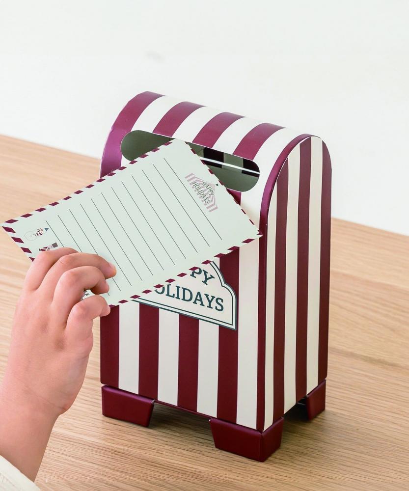 レトロなストライプ柄が目を惹く小さなポストは、子育て中のママ・パパ必見。サンタさんへの手紙を投函できる、なんともキュートなアイテムです。裏側に扉が付いているので、中身を取り出すことも◎。